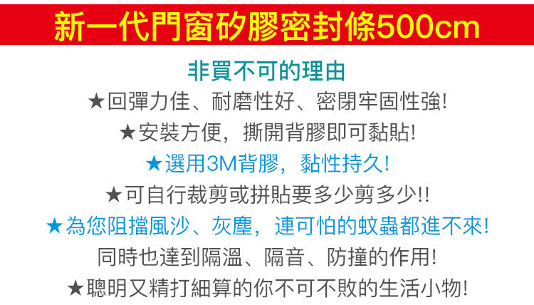 多功能門窗密封條!防冷暖氣外漏,防止蚊蟲、蟑螂入侵,擋風隔音,一貼就ok!密封牢固,防撞回彈性佳,3M背膠,黏性持久,可任意剪裁喔! 超值10米僅$980!